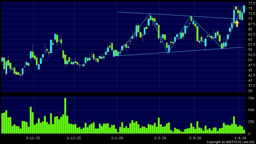 Triangle Breakout means the volatility of price movement is decreasing, stock price finally broke the top of triangle. An upward trend will start.(HK stocks quote is delayed for at least 15 mins.Short Selling Data as at 2026-04-17 16:25.)