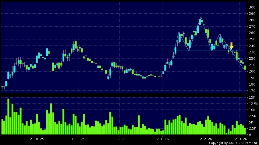 Head Shoulders top is a typical bearish signal, when stock price breaks the supportive level, downtrend would possibly start.(HK stocks quote is delayed for at least 15 mins.Short Selling Data as at 2026-03-05 16:25.)