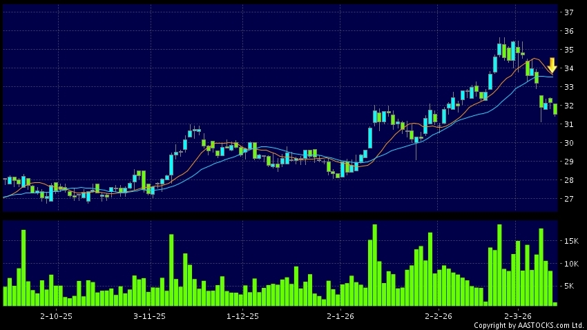 恒基地产(00012.HK) -1.080 (-3.358%) 沽空 $1.02亿; 比率 38.296% 10天移动平均线跌穿20天移动平均线,出现死亡交叉。现价报31.540,下跌1.928%,成交量1.57百万股,成交额4.95千万。