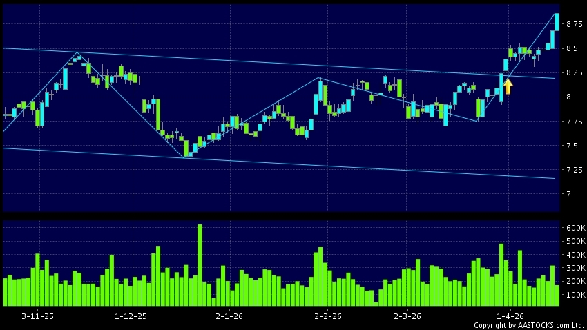 区域突破指股价在过去的一段时间只在一个范围在内活动,然後股价上升作出突破,升穿区域的顶部,技术走势向好。(港股报价延迟最少十五分钟。沽空资料截至 2026-04-21 12:25。)