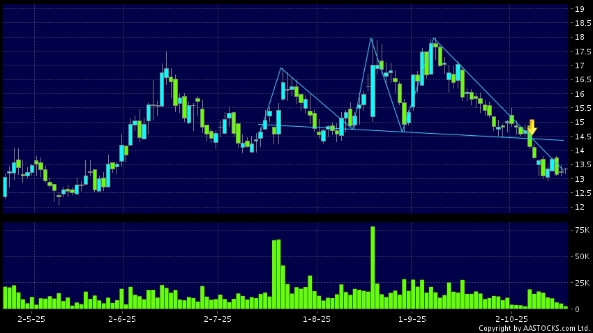 头肩顶是典型的沽出讯号,当股价跌穿支持线(颈线)时,跌势确认股价将持续下跌,技术走势偏软。(港股报价延迟最少十五分钟。沽空资料截至 2025-10-22 12:25。)