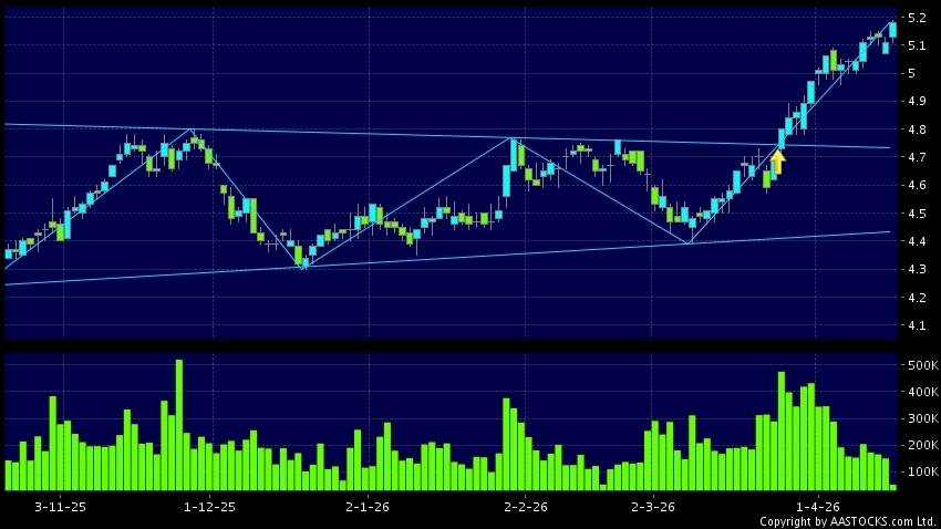 三角形向上突破是指股价的波幅渐渐收窄,在图表上形成三角形般的状态。股价在三角形的末端向上突破,形成上升趋势,技术走势向好。(港股报价延迟最少十五分钟。沽空资料截至 2026-04-21 16:25。)