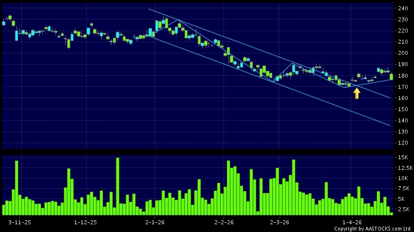 区域突破指股价在过去的一段时间只在一个范围在内活动,然後股价上升作出突破,升穿区域的顶部,技术走势向好。(港股报价延迟最少十五分钟。沽空资料截至 2026-04-22 16:25。)