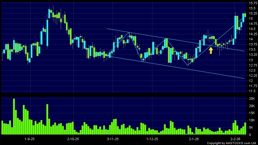 區域突破指股價在過去的一段時間只在一個範圍在內活動,然後股價上升作出突破,升穿區域的頂部,技術走勢向好。(港股報價延遲最少十五分鐘。沽空資料截至 2026-02-09 12:25。)