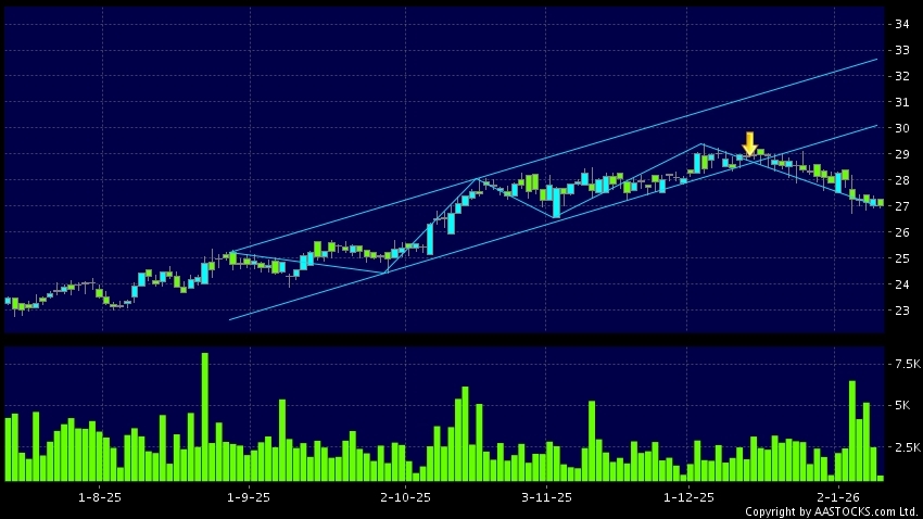區域突破指股價在過去的一段時間只在一個範圍在內活動,然後股價下跌作出突破,跌穿區域的底部,技術走勢偏軟。(港股報價延遲最少十五分鐘。沽空資料截至 2026-01-20 16:25。)
