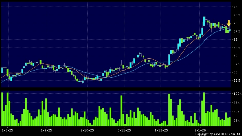 中國平安(02318.HK) +1.100 (+1.642%) 沽空 $8.41億; 比率 39.330% 10天移動平均線跌穿20天移動平均線,出現死亡交叉。現價報68.100,上升1.642%,成交量3.46千萬股,成交額23.62億。