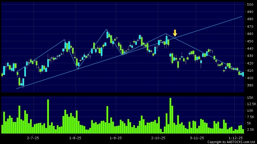 香港交易所(00388.HK) +1.000 (+0.246%) 沽空 $1.11億; 比率 8.023% 呈現頭肩頂向下突破。現價報407.400,上升0.246%,成交量2.78百萬股,成交額11.28億。